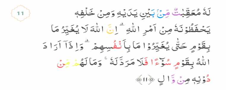 Baginya ( manusia) ada malaikat-malaikat yang selalu menjaganya bergiliran, dari depan dan belakangnya, mereka menjaganya atas perintah Allah. Sesungguhnya Allah tidak alkan merubah keadaan suatu kaum sebelum mereka mengubah keadaan diri mereka sendiri. Dan apabila Allah menghendaki keburukan terhadap suatu kaum, maka tak ada yang dapat menolaknya, dan tidak ada pelindung bagi mereka selain Dia. (QS : Ar-Rad :11)