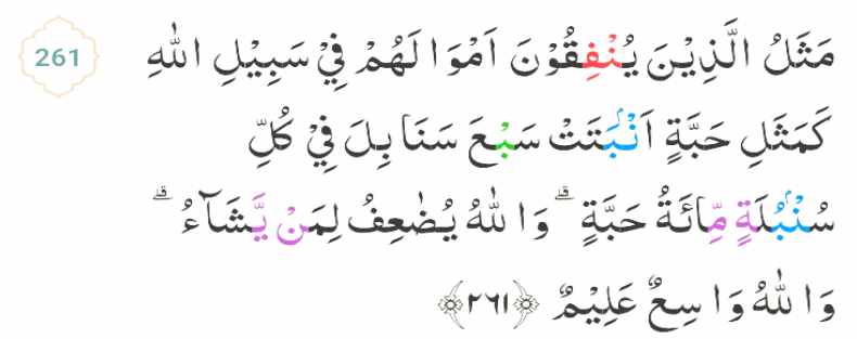 Artinya : Perumpamaan orang-orang yang menginfakkan hartanya di jalan Allah adalah seperti (orang-orang yang menabur) sebutir biji (benih) yang menumbuhkan tujuh tangkai, pada setiap tangkai ada seratus biji. Allah melipatgandakan (pahala) bagi siapa yang Dia kehendaki. Allah Maha luas lagi Maha Mengetahui.